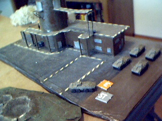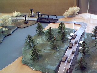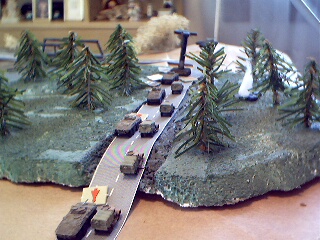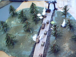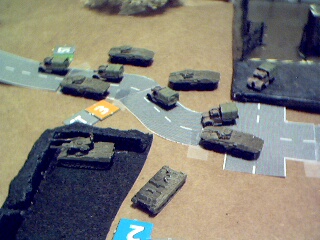 As the convoy started out along the road, a hidden marker was revealed: Hunter-Killer VTOLs! They were at the south side of the bridge and heading along the convoys path. It was the Technoids move and the VTOLs attacked, thinking it was like shooting fish in the barrel, only to be met by a hail of autocannon fire (from the escorts taking opportunity fire). The lead VTOL crashed and burned in the woods and and the Command VTOL was damaged.