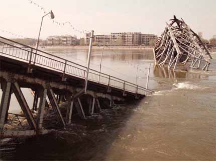 The caption for the bridge reads, "The bridge over the Danube river in Novi Sad, northern Serbia, lies in pieces in the river 01 April 1999 after it was destroyed by NATO warplanes. NATO bombing raids continue over Yugoslavia for the ninth day." Picture from the Agence France-Presse.