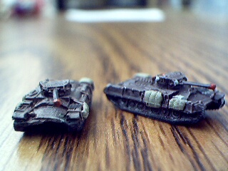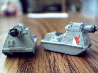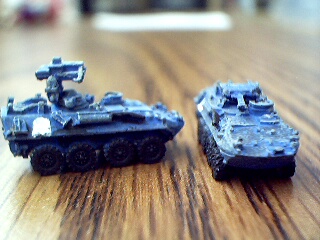 LAV-AT by GHQ These were painted a deep blue (almost a ultra-marine blue) and then dry-brushed with light field gray to pick out the details. I painted the tires and exhaust pipe black and have left them that way. That white spot is where I am planning on painting a unit insignia or something. You may notice that the turret on the LAV on the right looks funny. It came from the Valentine tanks when I swapped turrets. It looked okay, besides these are used in a sci-fi campaign! |