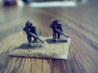 Kurita Infantry (8mm) by FASA/Ral Partha These don't really match the scale of my other miniatures, but they do look pretty good on the table - their large size allows more detail maybe. If the picture wasn't so dark, you could see their tan armor and olive fatigues. The guns are gunmetal. I've based them on plasticard (from a milk jug). |