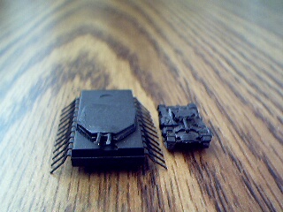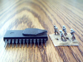 These are the smaller chips (about 2 cm long). The one on the left has a MLRS (Med Arty) turret made from a jumper and based on piece of card. The one on the right is the Light Walker that serves as the back bone of the Technoid army. Its turret is made from two pieces of cardboard punched out by a hole-puncher with a bit of wire stuck in a notch I cut out. You can see the DS2 stats in the Technoid Orbat |
