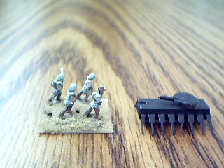 Some of the chips I pulled out were bigger than the others and so I turned them into heavier tanks. I used the same method of two pieces of thin cardboard glued together to make the turret. After the turret had dried I trimmed the sides and then drilled two holes in the front with a pin vice (a very small hand drill) and stuck two short bits of wire in as the laser barrels. |