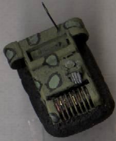 The actual colors have been distorted by my camera (Update: the new pictures show the correct colors), but I used a olive drab paint (by Ral Partha I think) over a black spray paint base coat. The camouflage was done by painting black spots all over the vehicle and then, once they were dry, painting inside them with leaf green. The skirt around the vehicle and the was left black.