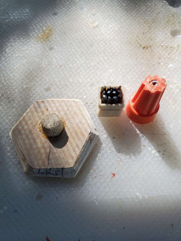 These scratch-built models are inspired from the HBS Battletech computer game. I used random bits from a box that has things I've collected over many years from scrap electronics and plastic. I roughly scaled them to match the Ral Partha miniatures, though the weapons might be slightly oversized for what they represent.