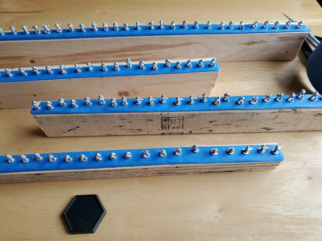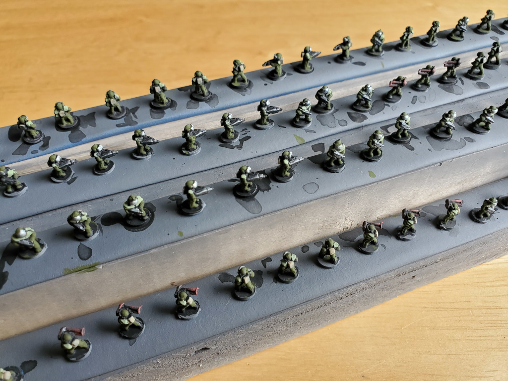 Since these are standard infantry, I put 7 figures on a base, 3 of them would have the specialty weapon if appropriate.