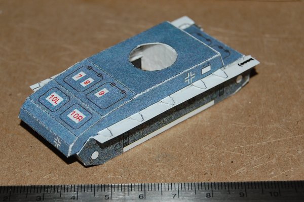 On Friday I used craft store acrylics to paint the exposed card edges. I used "gunmetal" on the barrel and the track edges. Then I mixed aluminum, blue and black to try to match the unusual coloring on the rest of the hull. It's not panzer gray, that's for sure, and it looks even bluer outside. But regardless of the color, it's was a fun model to build and I plan on a few more for my Early German army.