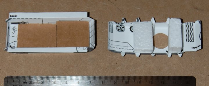 Since these models are intended to be used in my wargames and they'll be handled often, I usually try to reinforce the hull and turret so it will stand up to use better. For this one I used a combination of corrugated cardboard in the bottom and Styrofoam in the top. I especially wanted to make sure the top of the hull wouldn't bend when someone turned the turret.