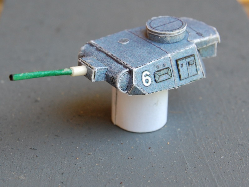 The turret is made from one piece of paper and has no bottom, so I filled it with a layer beveled cardboard and foamcore. The gun mantle is two parts, the inner structure and sides and then the outer curved piece that would move with the gun barrel. The instructions say to use a toothpick for the barrel, but not having one the right diameter, I rolled a gun barrel out of 65# card from my wife's card scraps. The roll of tape at the base of the barrel hides where I accidentally bent the tube when inserting it into the gun mantle.