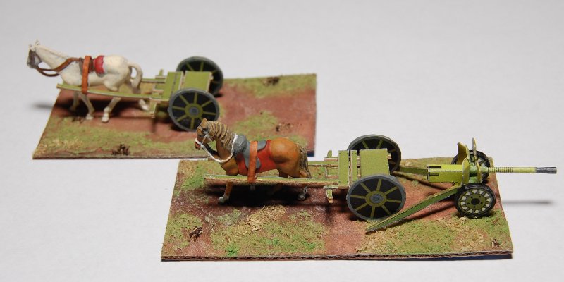 Although trucks or halftracks were the standard transport for AT guns, there were still many horses in active duty. The 25mm was light enough to pulled by such a horse limber, so I made one out of card. There is room for an ammuntion box and the crew on top of the limber, but I haven't made those yet.