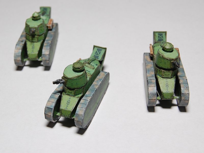 The FT-17 was used a lot in WWI and the Spanish Civil War by was obsolete in 1940. Still it was used by units who had not yet switched to newer models. These tanks are made out of card. In Crossfire the stats for the light tanks are all grouped together, so I went with what was available rather than try to get a R-35/R-39 or H-39 that would be more WWII-ish.